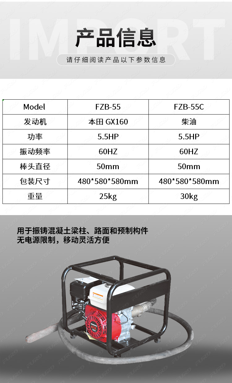 用于振鑄混凝土梁柱、路面和預(yù)制構(gòu)件。 無電源限制,移動靈活方便。