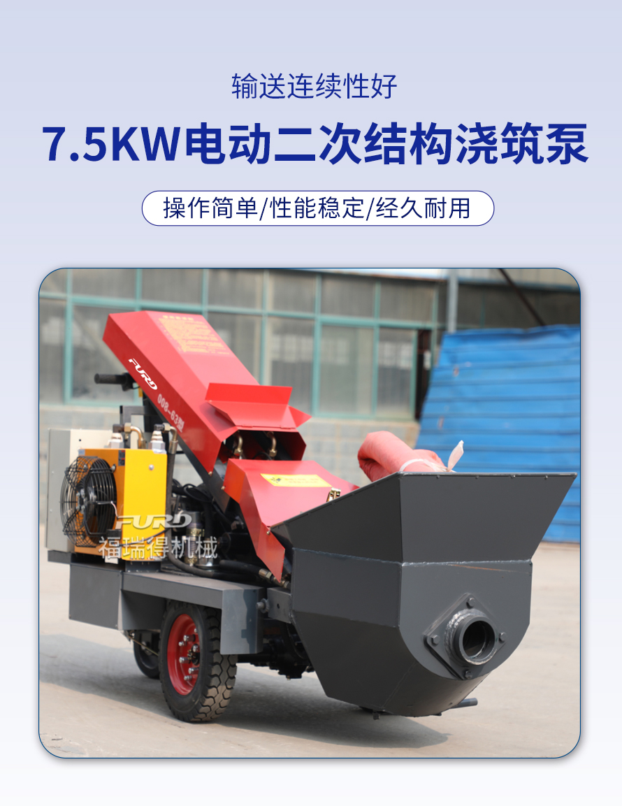 福瑞得二次結(jié)構(gòu)澆筑泵適用于商品房、農(nóng)村建房,打二次構(gòu)造柱,圈梁等,是您澆筑的好設(shè)備。電機(jī)功率小,體積小,重量輕,料斗可升降,真正能提高您的施工效率,是人工澆筑的幾十倍。